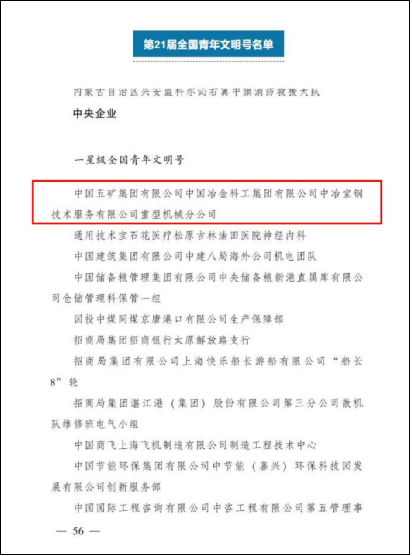 9月19日,共青團中央、最高人民法院、國家發展改革委、工業和信息化部、公安部、司法部、交通運輸部、水利部、商務部、國家衛生健康委、應急管理部、國務院國資委、全國工商聯等23家全國創建青年文明號活動組委會成員單位聯合印發《關于命名第21屆全國青年文明號并進行星級認定的決定》(下稱《決定》)。中國五礦、中冶集團所屬中冶寶鋼重型機械分公司榮獲“一星級全國青年文明號”。
